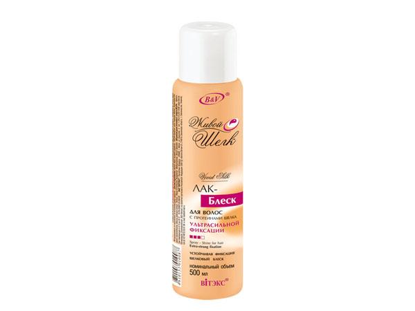 - Лак-блеск «С протеинами шелка» ультрасильной фиксации от Белита Витэкс. Позволяет сохранить прическу в любую погоду. Не склеивает волосы, выглядит естественно и блестяще. Подходит всем типам волос. Стоимость лака — 175 руб.