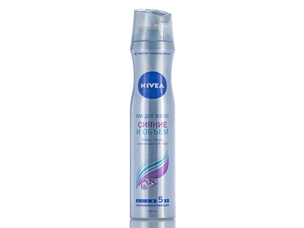 - Nivea «Сияние и объем». Обеспечивает экстрасильную фиксацию прически на 24 часа. Не склеивает волосы. Стоимость — 259 руб.