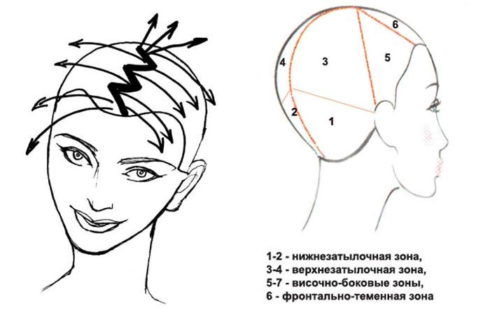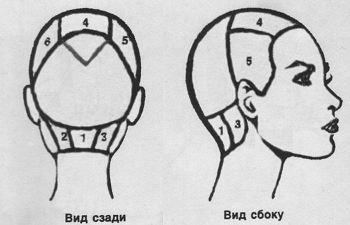 - Разделите зоны по эскизу: затылок, виски, теменная часть.
