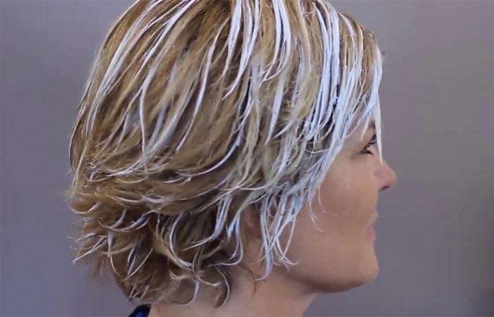 - Начиная с затылочной зоны, вертикальными мазками, мастер наносит красящее средство на выбранную прядь. В зависимости от способа, прокрашиваются либо кончики, либо вся прядка. Главное, чтобы краска ложилась неравномерно, а большая ее часть наносилась на нижние участки.