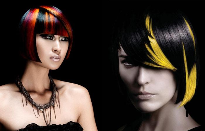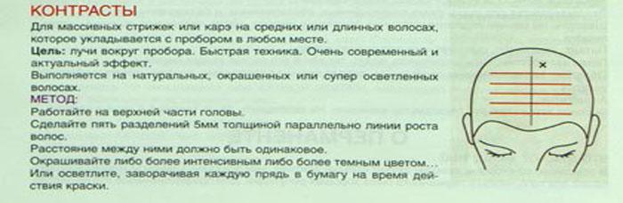 - Контрасты. Идеально смотрятся на объемных шевелюрах. Выполнение: необходимо сделать 5 проборов по 5 мм каждая параллельно линии роста. Покраска производится интенсивным или очень темным красителем.