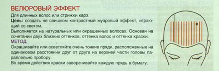 - Велюровый эффект. Выполняется на длинных тонких локонах, каре. Применяют 2 соседних оттенка. Окрашивают волосы, находящиеся на одном расстоянии один от другого сверху на голове параллельно пробору. Техника добавляет объема прядям.
