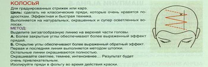 - Колосья. Производится покраска на проборах зигзагообразной формы, предусмотрена для стрижки каре и иных градуированных типажах. Здесь можно использовать большое разнообразие оттенков. Выполнение: делается зигзагообразный пробор, начальная линия и последняя производится способом штопки. Остальные локоны красятся целиком.