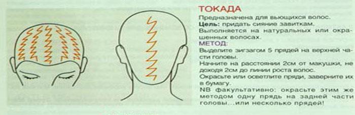 - Токада. Отлично подходит для вьющихся локон. Данная техника акцентирует красоту их и природность. Окрашивание делается на 5-и зигзагообразных проборах.