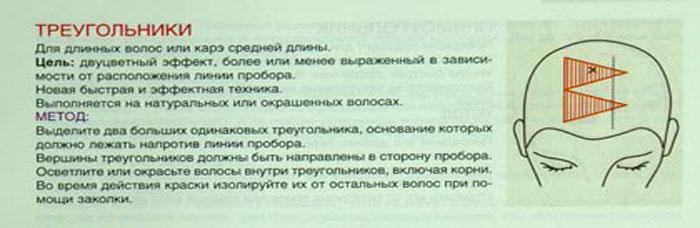 - Треугольники. Вершины треугольников начинаются у пробора, их основания параллельны пробору. Пряди в середине фигуры выкрашиваются одним светлым тоном, другие оставшиеся – темным. Здесь предпочтительны резкие контрасты. Хорошо выполнять на длинных шевелюрах и каре.
