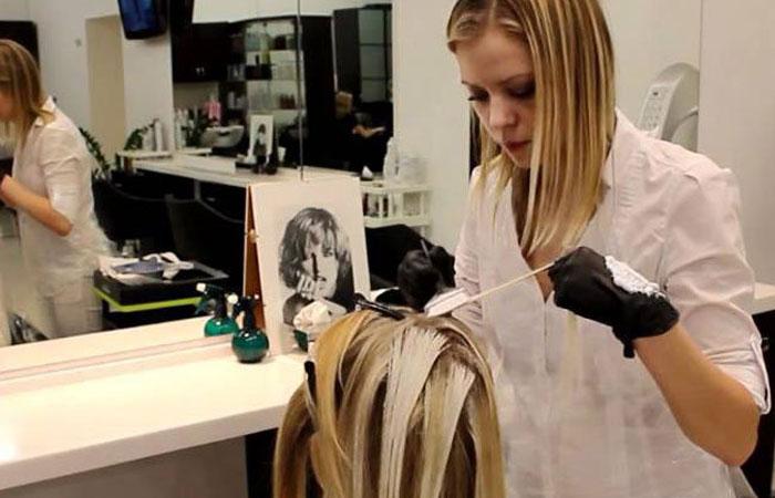 - Подобным способом окрашивается вся шевелюра. Обязательно делается незначительный отступ от корней. Мазки производятся хаотично кистью, на некоторых прядках можно сделать растушёвку цвета.