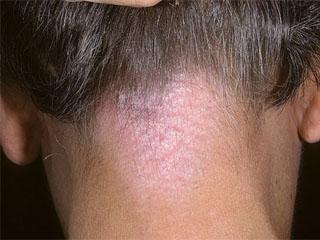 Псориаз можно заметить по небольшому шелушению кожи, возникающему локально определенными участками, а не повсеместно. Самая уязвимая часть — затылок. Если не заметить болезнь вовремя, то шелушащееся место станет зудеть и покраснеет.