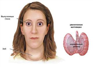 - Базедова болезнь — патологический процесс в организме, вызванный резкими нарушениями работы щитовидной железы. Основными симптомами заболевания являются выпуклые, увеличенные в размерах глаза, отечные веки, постоянное ощущение тревожности и головная боль, нарушение обменных процессов и баланса гормонов в организме. Избыток тиреоидных гормонов вызывают тяжелые осложнения нервной системы, сердца и печени.