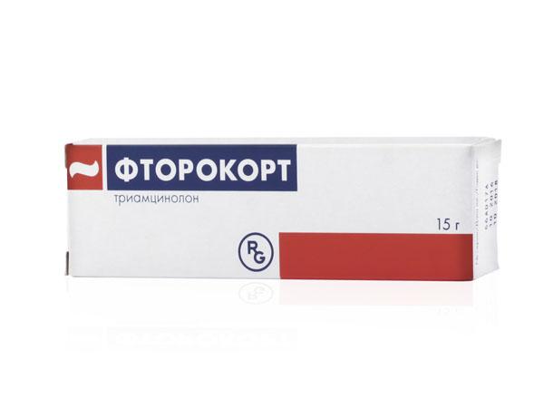 - Кортикостероиды. Форма выпуска мазь или крем. Наиболее популярным средством является мазь Фторокорт — препарат противовоспалительного, противоаллергического действия. Используется при заболеваниях кожных покровов, чувствительных к лечению глюккортиокстероидами. Риски развития побочных эффектов минимальны. Препарат нельзя наносить на поврежденные участки кожи. Средняя цена — 200 рублей.