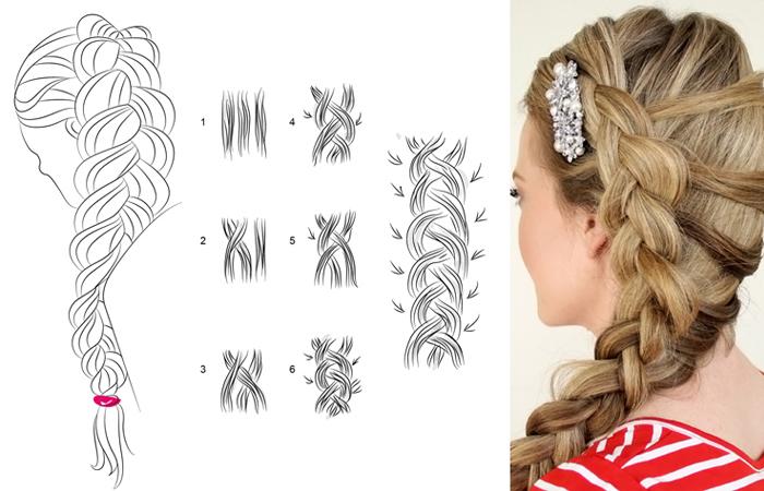 Любую прическу начинают с мытья шевелюры. К укладке приступают после полного высыхания волос. Как этого добиться каждый решает самостоятельно: можно воспользоваться феном или выждать время, необходимое для естественной сушки. Обратную французскую косичку в классическом варианте выполняют по следующей схеме: