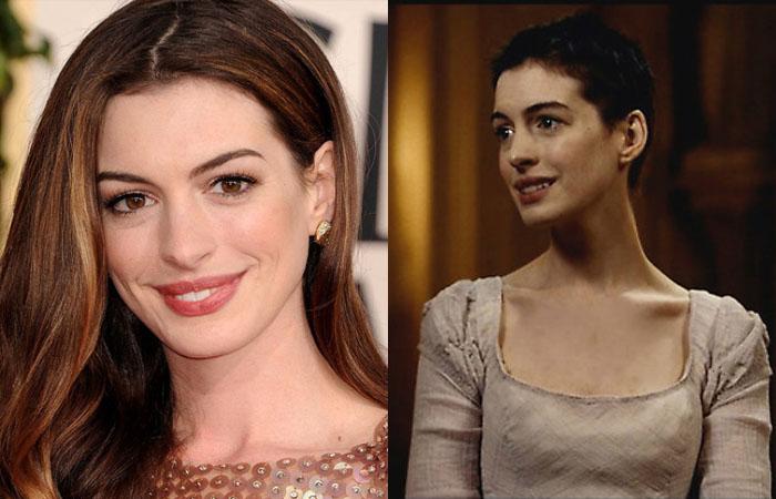 Энн Хэтэуэй в фильме «Отверженные» предстала перед зрителями с ультракороткой стрижкой. Героиня мюзикла, которую сыграла Энн, для спасения собственной дочери продала волосы и зубы, стала проституткой. Для съемок в картине актриса не только лишилась шевелюры, но и похудела на 11 кг. Подобные жертвы ради искусства, талант Хэтэуэй были высоко оценены кинокритиками и зрителями. Энн получила свой первый «Оскар».