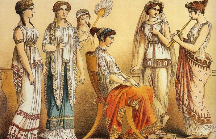 Самые первые одежды жителей Эллады не требовали шитья. Квадратный отрез ткани располагали вокруг тела и скрепляли на одном плече. Наряд дополняли поясом. Ткань была грубой и невзрачной. Чуть позже появился хитон — рубашка-чехол, украшенная складками. Из косметики греки использовали натуральные гипсовые и цинковые белила, растительные румяна. А вот к ароматам и благоуханиям греки были неравнодушны, различные натуральные масла, экстракты растений применяли регулярно.