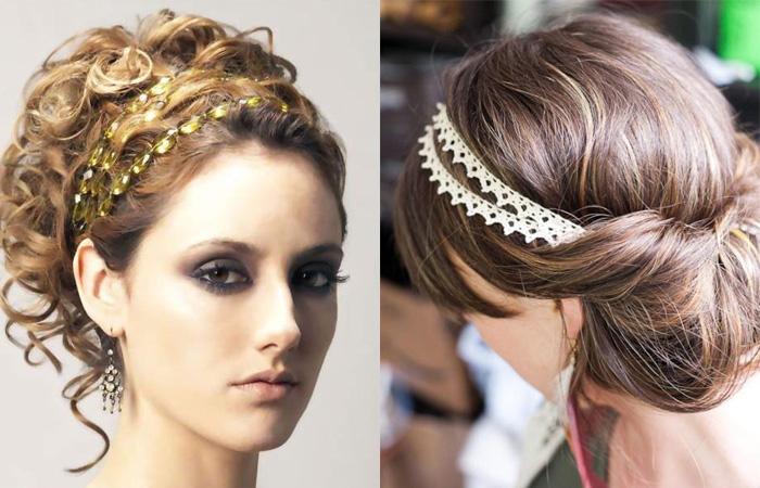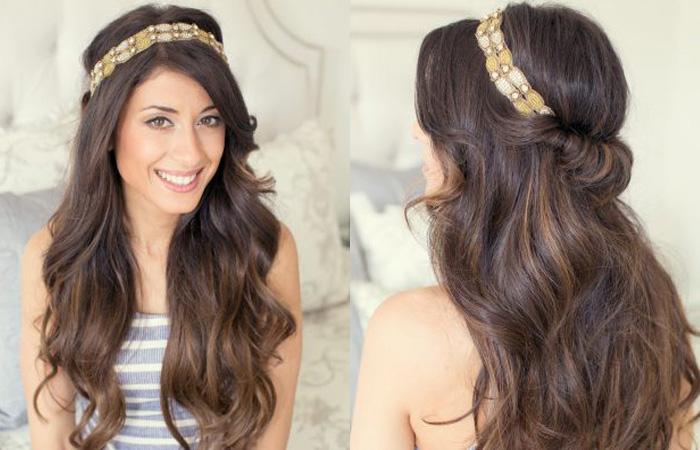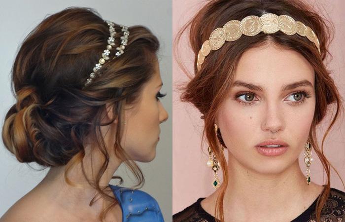 Прическа универсальная, подходит для торжественного события и на каждый день. Золотая, красивая повязка, ободок со стразами — неизменный атрибут для создания образа истинной богини. Использовать его можно несколькими способами: