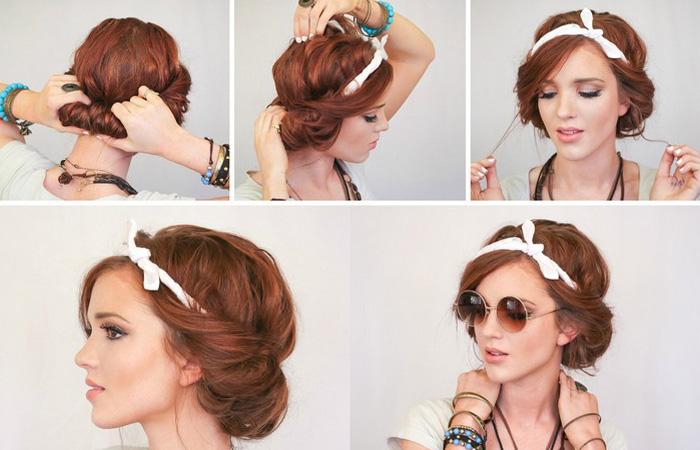 - Волосы можно спрятать за ободок. Этот вариант подходит девушкам с длиной локонов по плечи, чуть длиннее. Длинноволосым красавицам задача окажется сложнее. Рекомендуется добавить объема на затылке, для этого волосы слегка подкрутите.