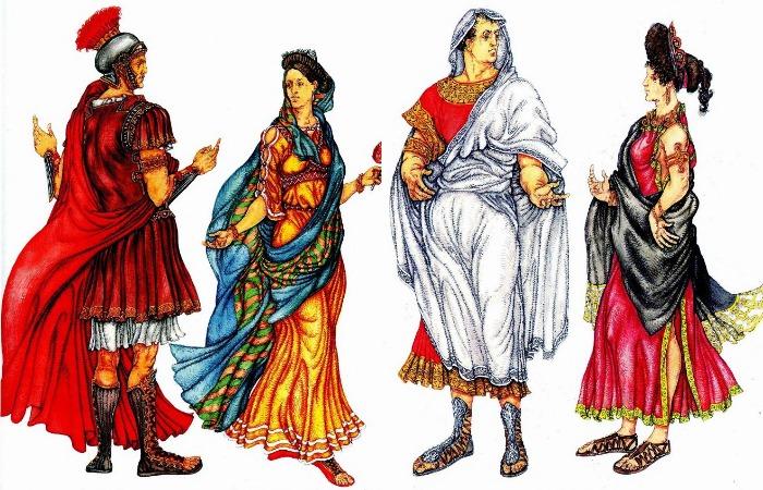 В одежде древних римлян присутствовала скромность, строгость, характерная для античности. Но в отличие от греков, жители Империи сшивали фалды тканей, создавая первые туники. В особом почете был пурпурный цвет, как символ власти имели носить право лишь императоры, полководцы.