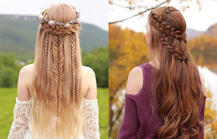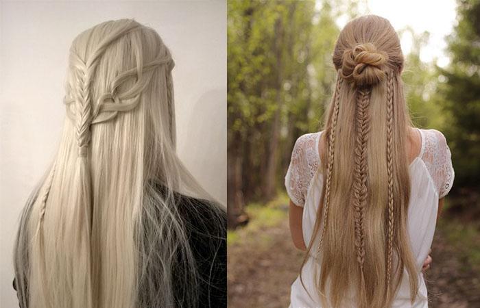 Для шевелюры с длиной от средней надо попробовать плетения. Делают несколько кос от темени. Элементы направляют назад. Реально сделать декоративную оплетку, соединяя косички в единую сеть, как у истинной эльфийки.