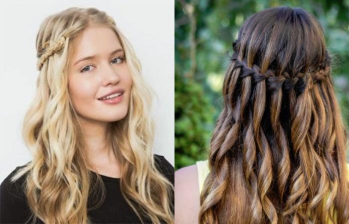 Французский «Водопад» состоит из горизонтальной косы и ниспадающих локонов. Романтическая укладка украсит любую внешность, подчеркнет нежность, красоту юных барышень. Визуально удлиняет овал, делает силуэт выше, стройнее. Часто используется как основа свадебных причесок, можно использовать и в качестве ежедневной укладки. Выполняется на густых вьющихся прядях, дополнив декором легко превратить в праздничный вариант.