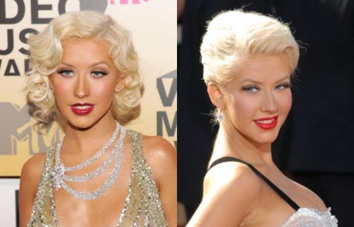 Кристина Агилера использует беспроигрышные сочетания белокурых локонов, голливудских волн и красной помады.