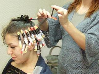 - После нанесения защитных средств начинается основной этап химической завивки. Следует накрутить пряди на коклюшки, толщина прядей при этом не важна, и нанести смешанные средства губкой.