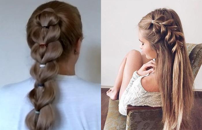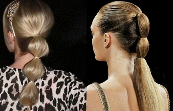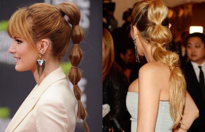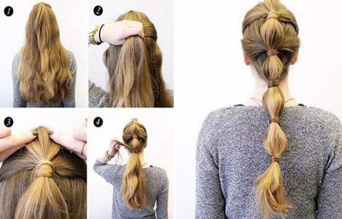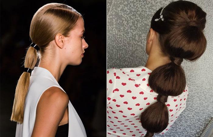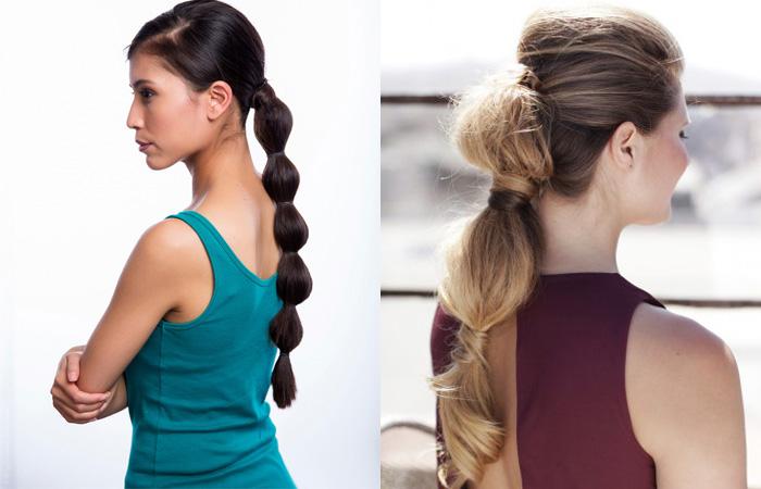 Современной вариацией перетянутого, ступенчатого, многоярусного или гирляндного хвостика стал элемент, разделенный на секции с помощью резинок. Крепежные материалы служат декоративными элементами. Каждое деление расправляют, придавая секции объем. Допустимо предварительно начесать пряди. Это добавит структуре фактурной пышности.