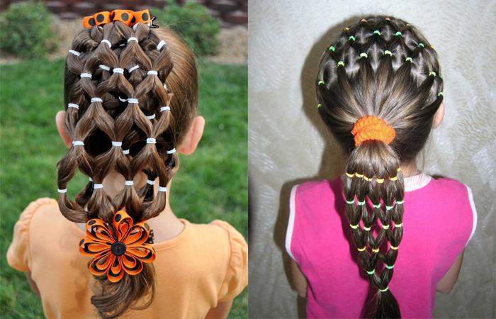 Достоин внимания хвостик со сложным переплетением в виде ячеек. Основой прически становится классический конский хвостик. Элемент разделяют на несколько мелких прядей, которые соединяют между собой резинками. В результате получается своеобразная плетенка из ромбовидных секций.