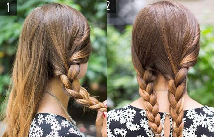 - Из каждой из них от затылка заплетите косы, добавляя сверху свободные пряди. Во время работы направляйте плетение вперед, держа его перпендикулярно шее.