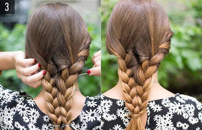 - Прядь №2 уложите под №3 и проведите над №4. Она станет крайней справа.