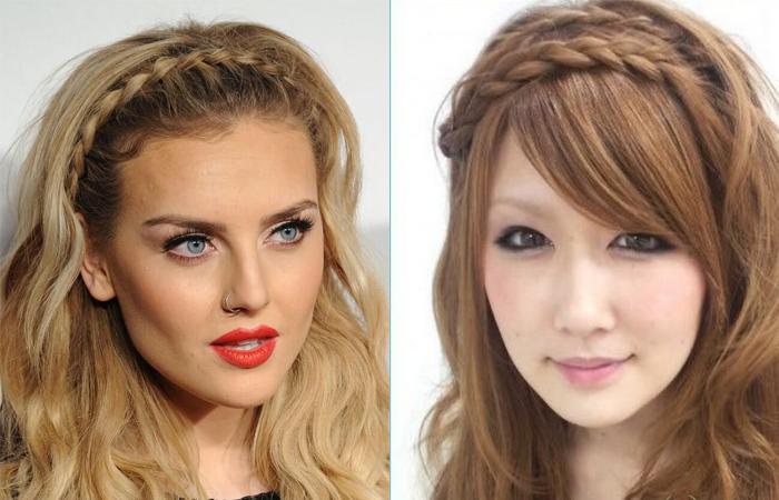 - круглое или угловатое лицо визуально подкорректируйте удлиненной, асимметричной челкой. Можно плести косу по всей голове, выпустив впереди боковые пряди, или уложить колосок с одной стороны;