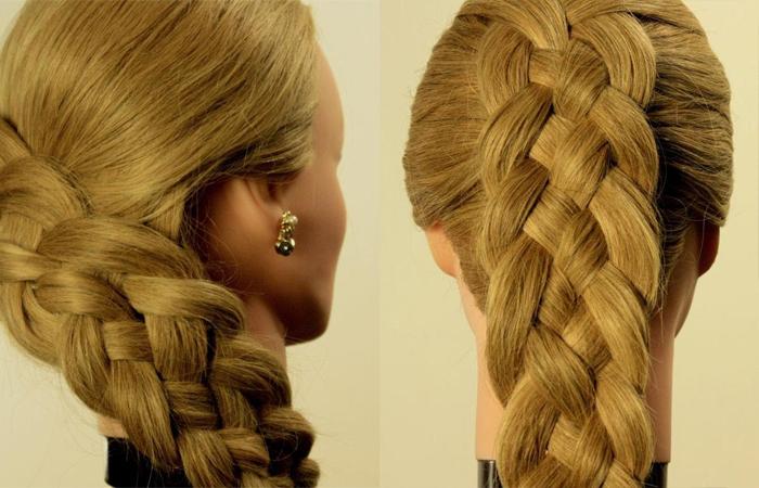 Роскошные варианты для тех, кто освоил технику трехпрядного плетения, имеет в арсенале длинные волосы и желает сделать свой повседневный или праздничный образ более оригинальным. Например, можно сделать косу из 4-х прядей: