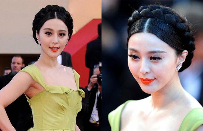 Аналогичную прическу делала и певица, актриса из Китая Фань Бинбин. В ее случае высокая укладка смотрится как роскошная корона. Как и Сальма, Фань отдала предпочтение прямому пробору.