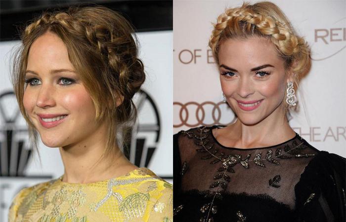 Другие знаменитости предпочли более свободные, небрежные варианты. Актриса Дженнифер Лоуренс часто выпускает боковые прядки, которые визуально корректируют ее круглый овал лица. Прическа в виде веночка не стала исключением.