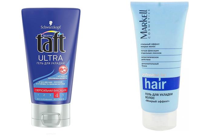 - Гель. Самый популярный продукт для моделирования мокрых локонов. Чаще всего применяется на короткой шевелюре. Желательно, чтобы гель имел слабую или среднюю степень фиксации, иначе прическа получится неестественной. Наносить его нужно равномерно. В этой категории есть такие продукты: гель-блеск Liquefy от Лонда (400–500 рублей), Pr.Wet Gel+Plus от Salerm (примерно 600 рублей), TAFT ULTRA от Шварцкопф (около 150 рублей), Markell proff (порядком 140 рублей) и др.