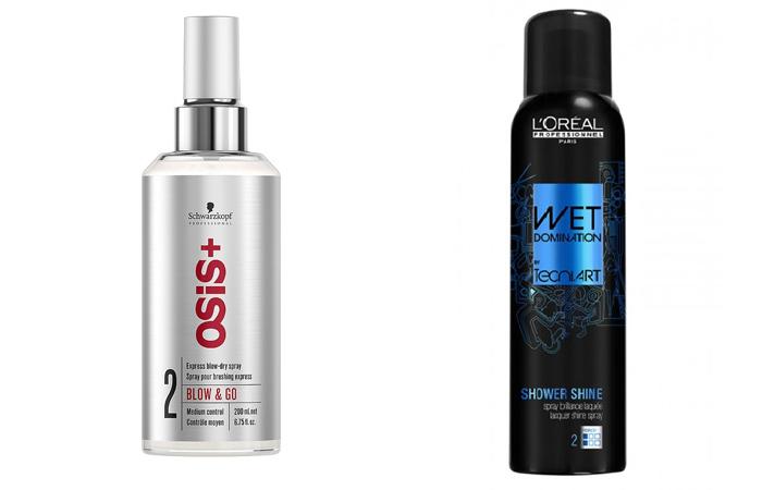 - Спрей или лак. Используются для средних и длинных волос, в том числе тонких. Не наносятся на прикорневую зону, чтобы не утяжелить шевелюру. Для ответственных мероприятий стоит выбрать лак сильной фиксации, для обычной укладки подойдет слабая или средняя степень. Спрей разделяет пряди, визуально делая их влажными, и обеспечивает аккуратность прически на целый день. Примеры средств: спрей Blow & Go из линейки OSIS+ от Schwarzkopf (около 900–1150 рублей), спрей-лак WET DOMINATION от Лореаль (примерно 1200–1300 рублей), спрей Radiant Blonde Beach Look Spray Sea Salt от Mades Cosmetics (порядком 600 рублей) и др.