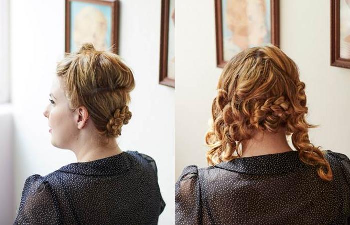 - Верхние локоны подберите, нижние уложите в косичку. Зафиксируйте ее резинкой.