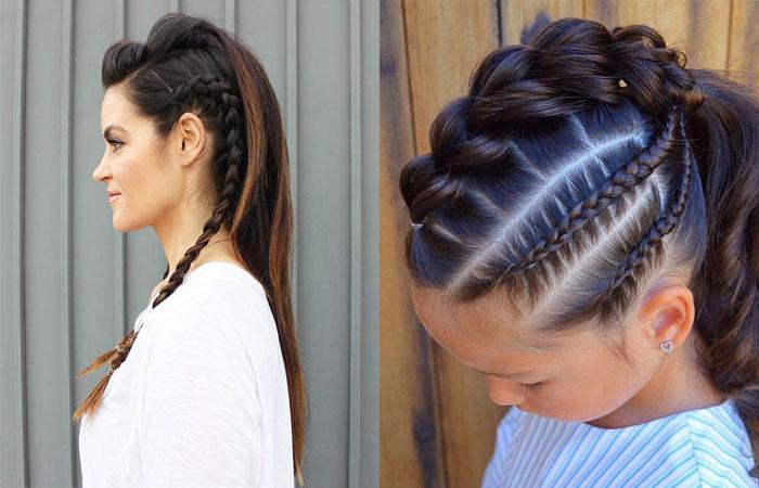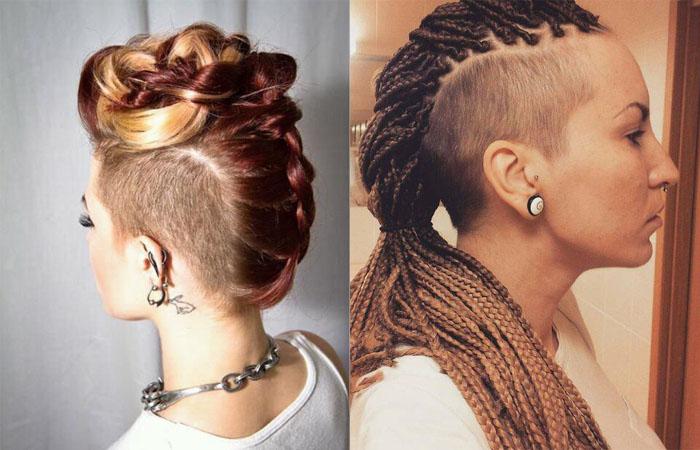 Имитация гребня удачно соседствует с выбритым виском. Прическа станет интереснее, если заплести несколько косичек: крупную объемную по центру, плоские у висков. Не обязательно следовать технологии французского или голландского плетения.