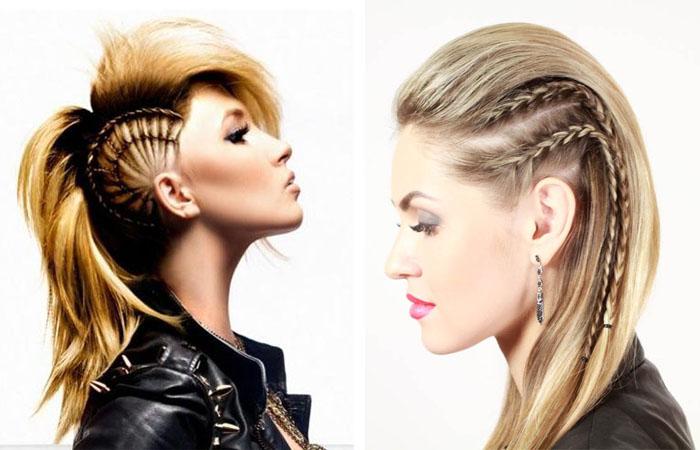 Для обладателей средней длины волос, каскадных стрижек удачнее станет вариант с «зализыванием» висков. Плетением опоясывают уши. Пряди центральной линии придется поставить вверх, имитируя ирокез.