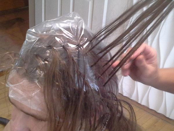 Расчесываем волосы и надеваем шапочку так, чтобы она плотно села на голову. Через отверстия специальным крючком или острым концом расчески вытягиваем пряди волос. Наносим краску на пряди и оставляем на время, необходимое для экспозиции состава, после чего смываем теплой водой.