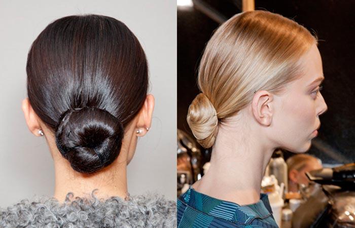 Гладкий вариант пучка пользуется не меньшей популярностью. Прическу выполняют по стандартной схеме, но волосы хвоста не дополняют плетением, а сразу накручивают на основание элемента. Такой вариант предполагает присутствие длинной шевелюры.
