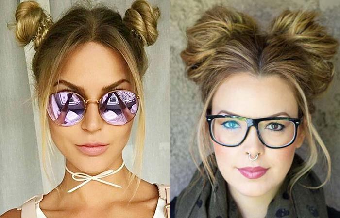 Игриво смотрятся две шишки, расположенные симметрично по бокам. Вариант из кос больше подходит молодым девушкам. Гладкие, объемные элементы допустимо использовать взрослым женщинам. Формируют как высокие, так и низко расположенные элементы.