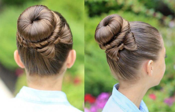 Объемную шишку выполняют с использованием накладки. Бублик надевают на хвост. Далее, делают гладкий пучок, оборачивая элемент прядями. Допустимо сохранить стандартную схему с косами или жгутами. В результате получается усовершенствованный балетный пучок.