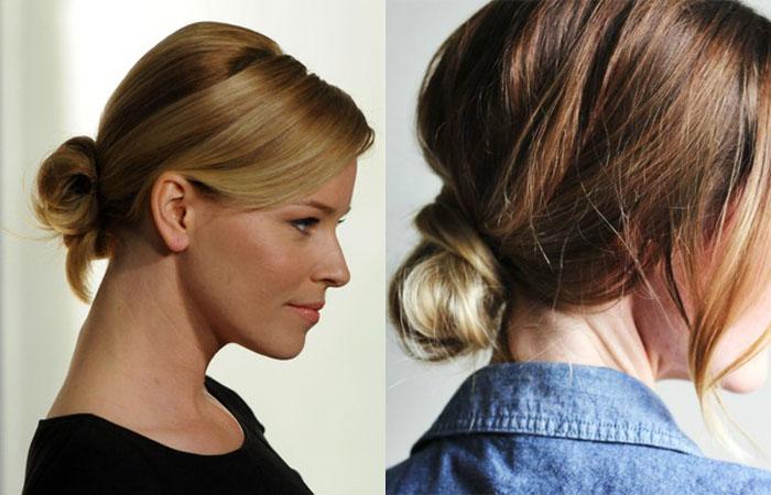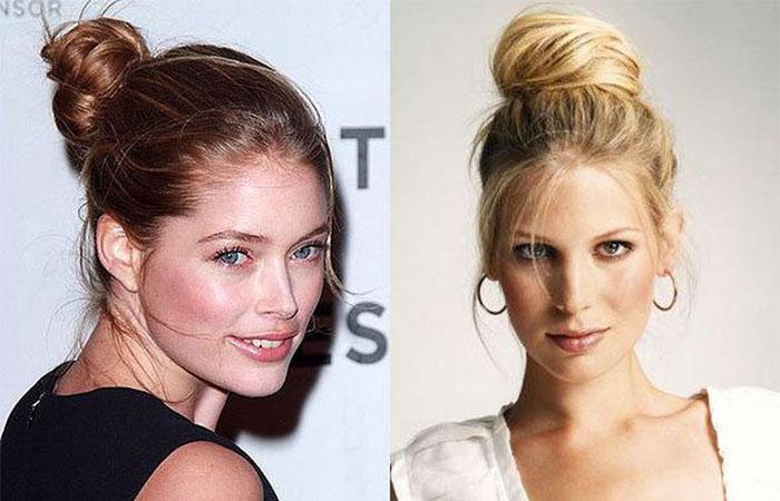 Объемный пучок из прядей небольшой длины — прекрасный вариант для повседневного, делового, романтического или праздничного облика. Гладкая конструкция, как у Анджелины Джоли, больше подходит для будней, строгого дневного образа. Пышные элементы, как у Дженнифер Лав Хьюит, удачнее вписываются в вечерний лук.