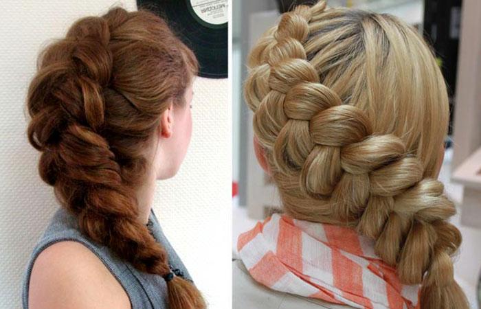 - Пышная коса. Идеальна для длинных локонов. На макушке делают начес, а далее выполняют французское плетение. Зафиксировав волосы внизу резинкой, сегменты косички аккуратно растягивают в стороны.