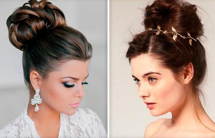 - Объемный пучок. Чтобы сделать эту нарядную или вечернюю прическу, подготовьте шпильки, невидимки, резинку для волос, плойку. Сделайте боковой пробор. Начешите макушку. На уровне ушей выполните горизонтальный пробор, нижнюю часть соберите в хвост. Накрутите эти волосы и боковые пряди. Хвост произвольно соберите в пучок. Заколите шпильками. Отделяя тонкие завитки от свободных боковых локонов, укладывайте их вокруг пучка, фиксируя невидимками. Оставьте пару прядей у лица.