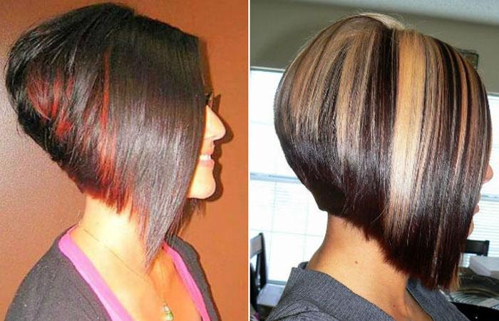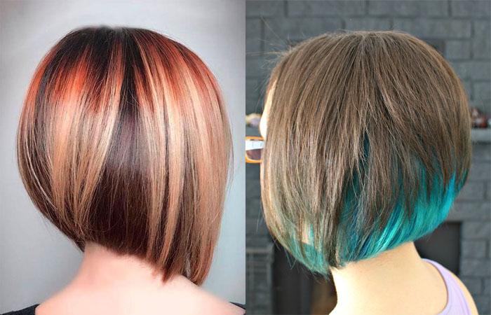 Боб на ножке яркая, привлекающая внимание стрижка. Дополнять прическу неординарными способами окрашивания необязательно. В редких случаях такое сочетание становится органичным. Для создания умеренного образа лучше выбрать натуральное окрашивание, мелирование. Для создания акцента подойдет многоцветное колорирование.
