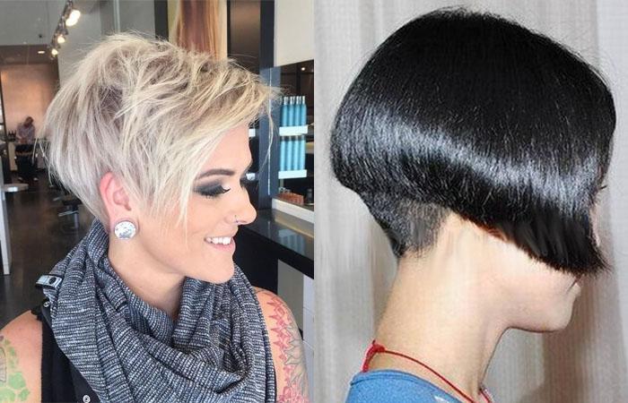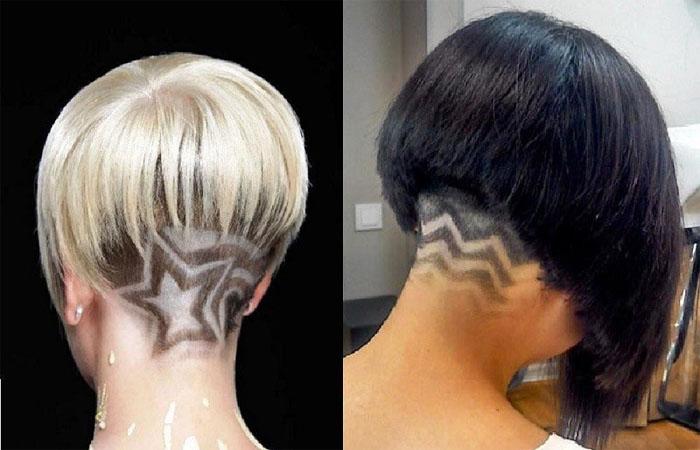 Интересно смотрятся осветленные кроющие пряди на фоне затемнения нижних или легкое омбре. Помимо окрашивания, креативные дамы разнообразят образ выбриванием узоров в области ножки.