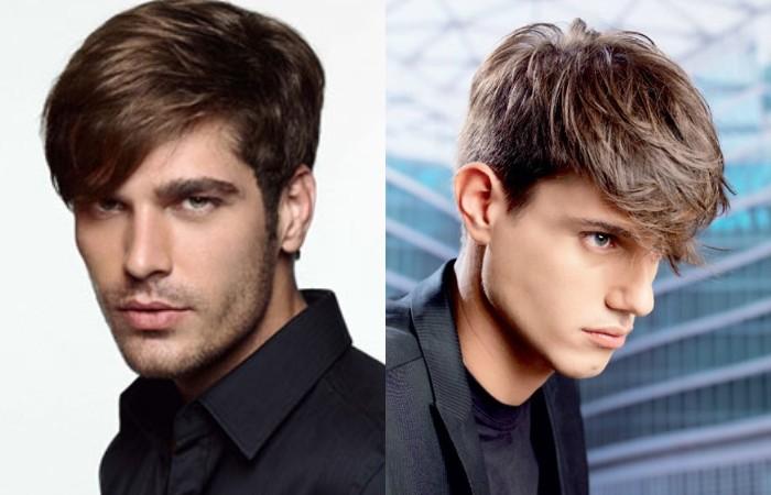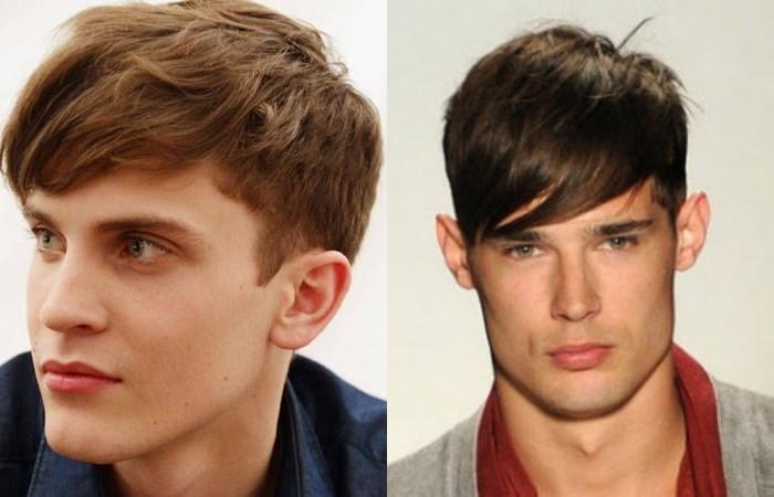 Вариант с челкой подходит парням с продолговатой формой овала. Асимметрия позволяет придать правильную форму, акцентирует внимание на взгляде. Создает романтичный образ, рекомендуется выбирать молодым парням. Сочетается с кэжуал и классическим стилем. Прическа практична и не вызывает сложностей в уходе, небрежные, динамичные нотки легко придать за несколько минут.