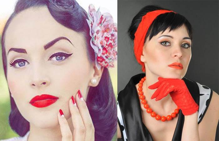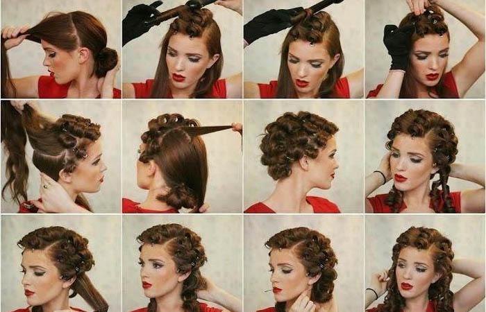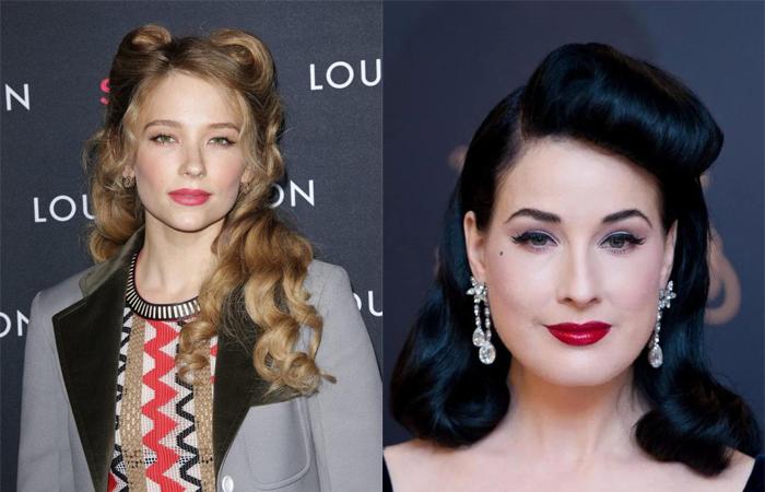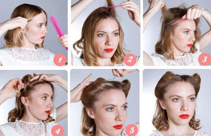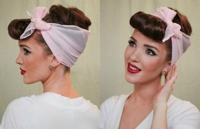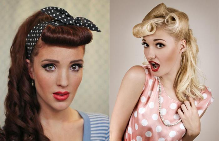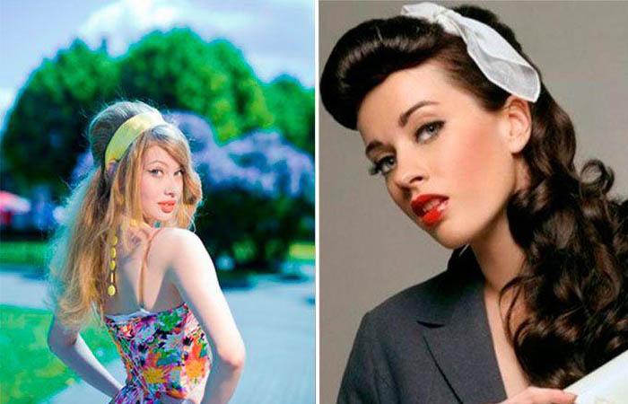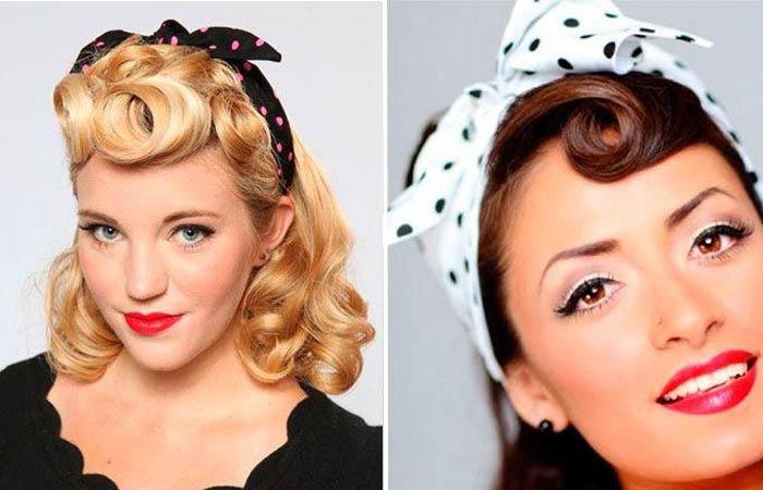 Кроме того, модницы 40-х–60-х годов укладывали шевелюру в высокий хвост, делали прически «Венчик мира» и «Victory Rolls», завивали голливудские локоны, крутили челку, начесывали пряди, дополняли образы косынками и т. д. В любом случае нужно помнить про ключевые особенности стиляжных укладок: элегантность, четкость и плавность линий, пышность и объем