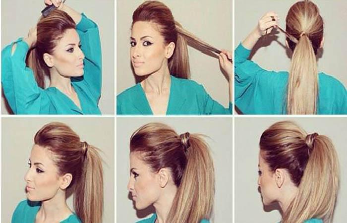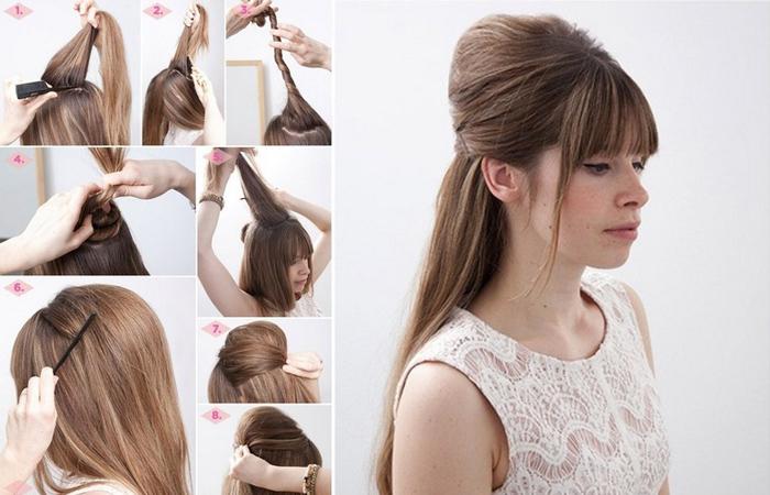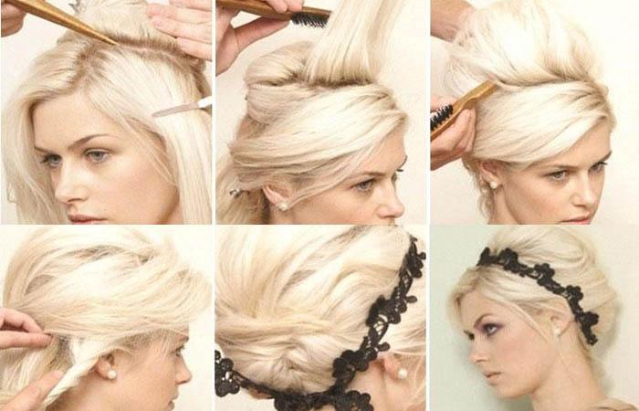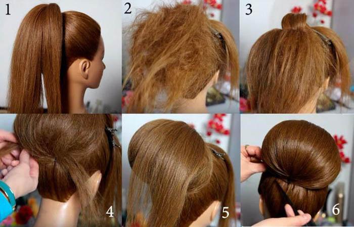 Почти все разновидности прически, предполагающей объем на макушке, рассчитаны на волосы средней и значительной длины. Классическая укладка обычно выполняется с начесом. Например, таким образом: