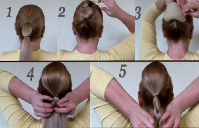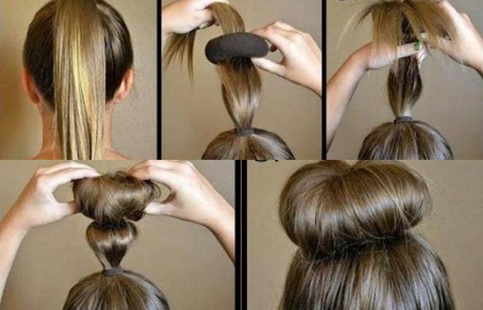 Кстати. Другой способ — надеть валик на хвост и равномерно распределить по нему волосы изнутри. Затем нужно обернуть прядями аксессуар, края спрятать под валиком. Если волосы очень длинные, удобнее укладывать их по одному локону. Прическу закрепите шпильками, невидимками, украсьте по своему вкусу.
