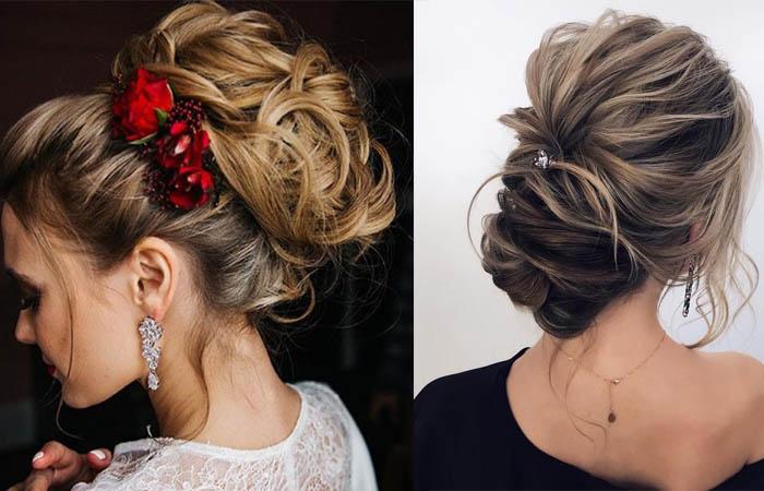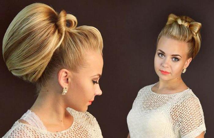 Эта прическа напоминает «Бабетту», но пучок получается пышным не за счет начеса. Например, можно накрутить волосы. Объемную гульку декорируют цветами, бантами.